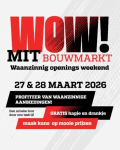 Noteer het alvast in je agenda: 27 & 28 maart vieren we de grote opening van de volledig vernieuwde MIT Bouwmarkt! Na een flinke uitbreiding van 1500 m² naar maar liefst 6000 m², zijn we er helemaal klaar voor om jou te verwelkomen.